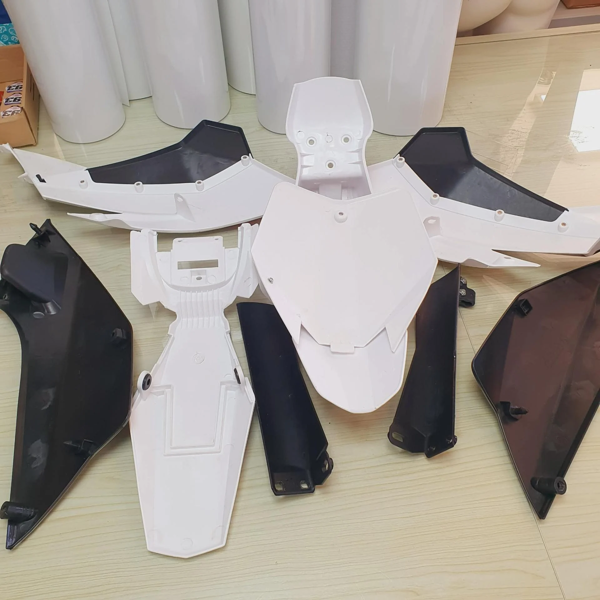 Kit plastique neuf démonté d'une moto montée à la carte. Le kit n'a jamais roulé, vendu avec les protection de fourche.